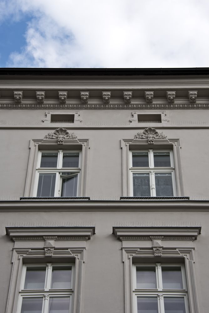 Štukovou výzdobu jsme důkladně očistili skalpelem a jednotlivé prvky precizně domodelovali do původního tvarosloví románským cementem. Pasivní plochy fasády jsme kvůli velké degradaci nahradili novou jádrovou a štukovou vápennou maltou včetně silikátového nátěru KEIM.