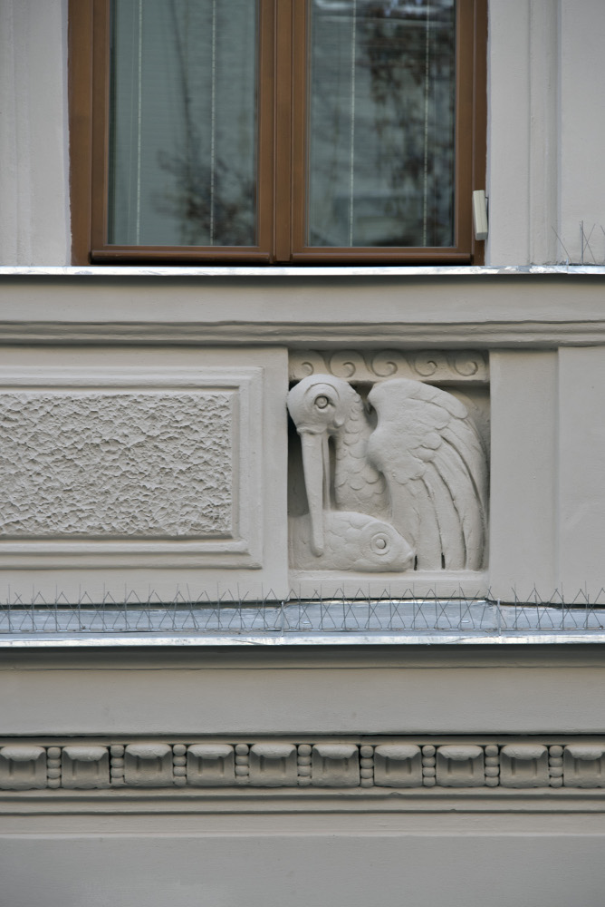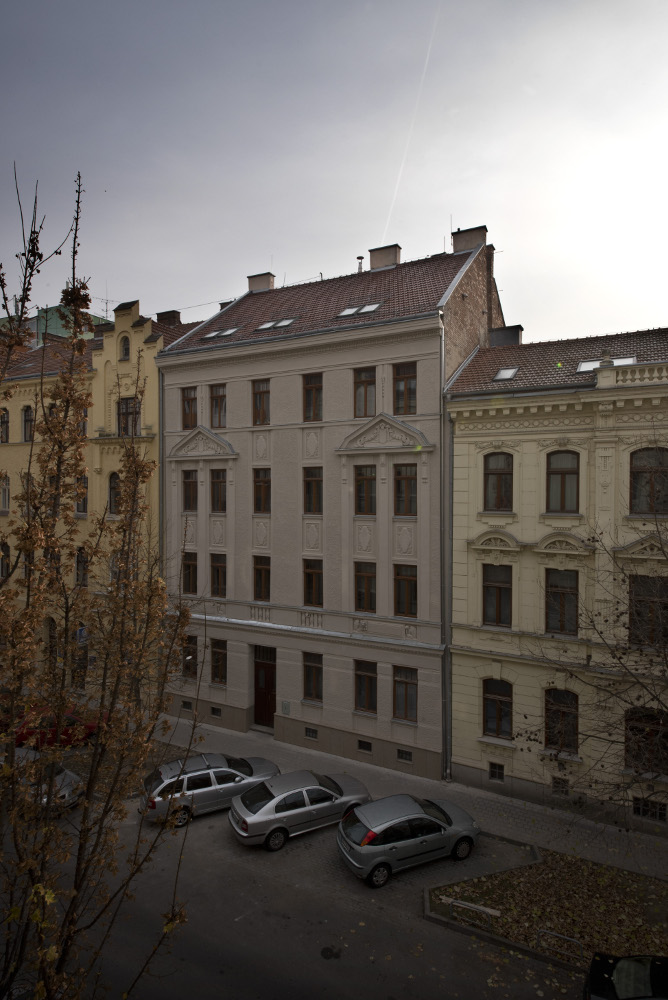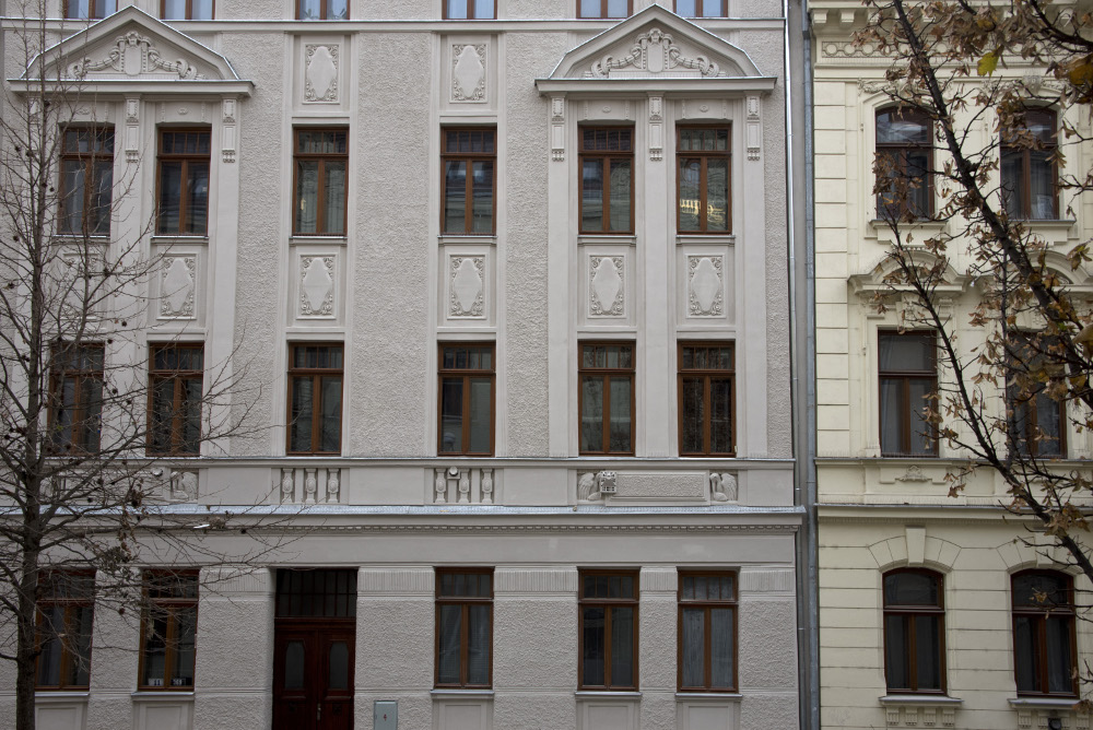 Čtyřpodlažní činžovní dům z roku 1900 byl ponechán bez oprav až do roku 2016. Silně degradované vrstvy původních omítek jsme nahradili novými čistě vápennými, tzv.“vytahovanou“ strukturovanou omítku jsme vytvořili po staru pomocí tvrdé štětky s krátkými štětinami do velmi suchého štuku. Zdobené a plastické prvky fasády jsme domodelovali z románského cementu. Celá fasáda je pak v monochromním provedení dle provedené stratigrafie původních vrstev na bázi sol-silikátu.